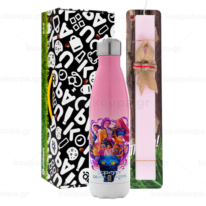 kpop Demon Hunters Huntrix, Easter Set, Metallic pink/white (Stainless steel) thermos, double-walled, 500ml & aromatic flat Easter candle (30cm) (PINK)