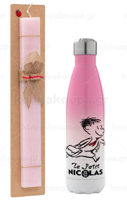 Le Petit Nicolas, Easter Set, Metallic pink/white (Stainless steel) thermos, double-walled, 500ml & aromatic flat Easter candle (30cm) (PINK)