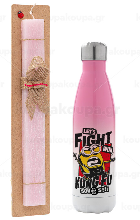 Minions Let's fight with kung fu sounds, Easter Set, Metallic pink/white (Stainless steel) thermos, double-walled, 500ml & aromatic flat Easter candle (30cm) (PINK)
