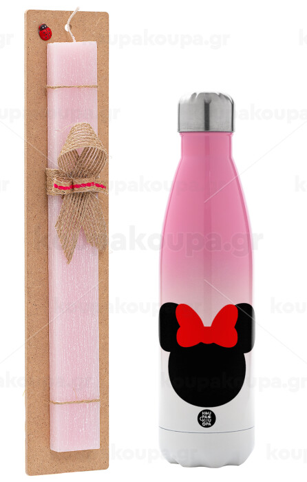 Minnie head, Easter Set, Metallic pink/white (Stainless steel) thermos, double-walled, 500ml & aromatic flat Easter candle (30cm) (PINK)