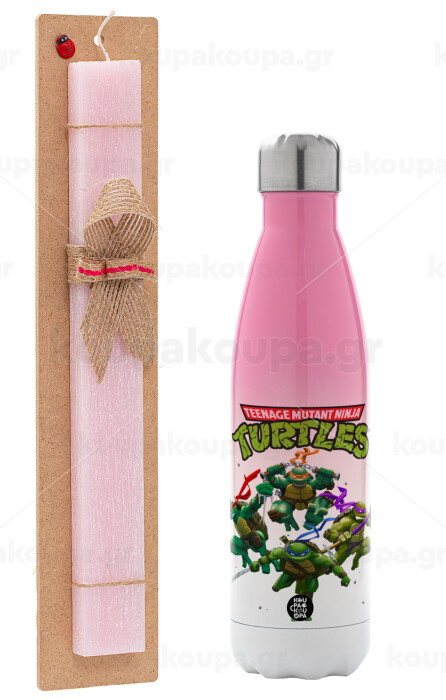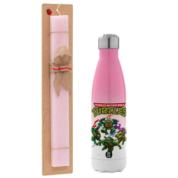 Ninja turtles, Easter Set, Metallic pink/white (Stainless steel) thermos, double-walled, 500ml & aromatic flat Easter candle (30cm) (PINK)