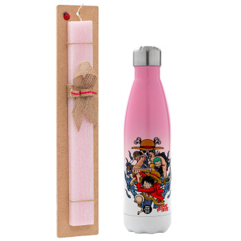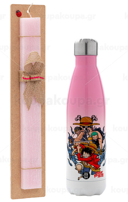 One Piece, Easter Set, Metallic pink/white (Stainless steel) thermos, double-walled, 500ml & aromatic flat Easter candle (30cm) (PINK)