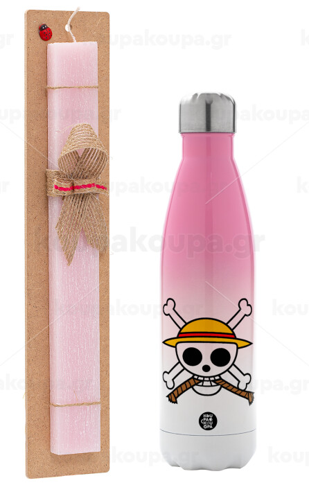 Onepiece skull, Easter Set, Metallic pink/white (Stainless steel) thermos, double-walled, 500ml & aromatic flat Easter candle (30cm) (PINK)