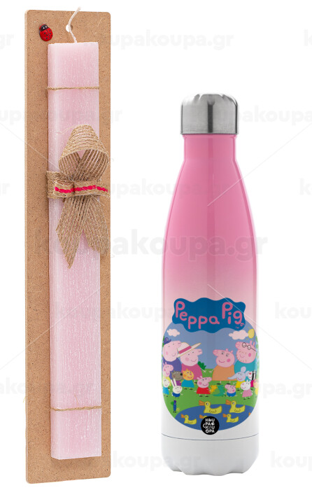 Peppa pig Family, Easter Set, Metallic pink/white (Stainless steel) thermos, double-walled, 500ml & aromatic flat Easter candle (30cm) (PINK)