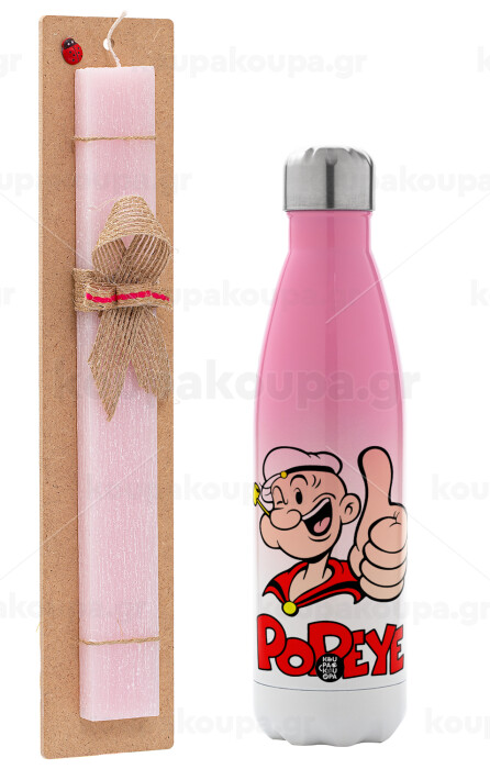 Popeye the sailor man, Easter Set, Metallic pink/white (Stainless steel) thermos, double-walled, 500ml & aromatic flat Easter candle (30cm) (PINK)