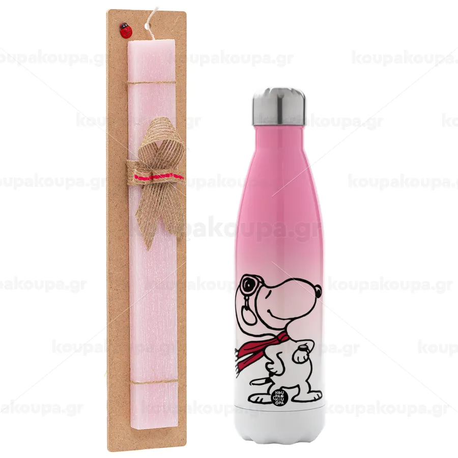 Snoopy ο πιλότος, Easter Set, Metallic pink/white (Stainless steel) thermos, double-walled, 500ml & aromatic flat Easter candle (30cm) (PINK)