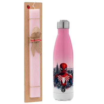 Spiderman City, Easter Set, Metallic pink/white (Stainless steel) thermos, double-walled, 500ml & aromatic flat Easter candle (30cm) (PINK)