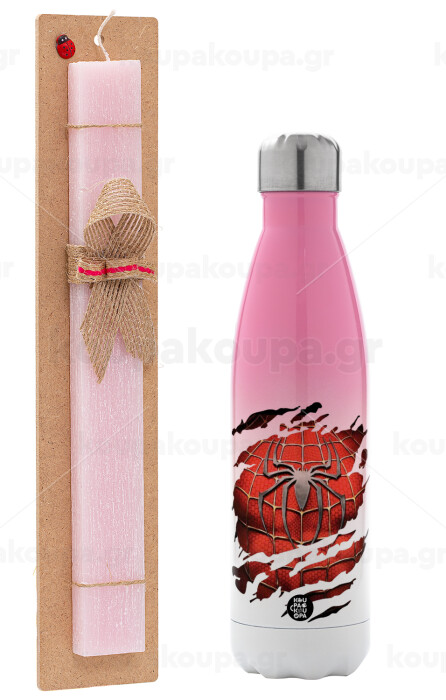 Spiderman cracked, Easter Set, Metallic pink/white (Stainless steel) thermos, double-walled, 500ml & aromatic flat Easter candle (30cm) (PINK)