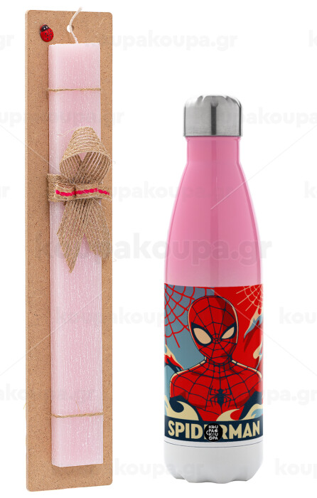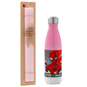 Spiderman kid, Easter Set, Metallic pink/white (Stainless steel) thermos, double-walled, 500ml & aromatic flat Easter candle (30cm) (PINK)