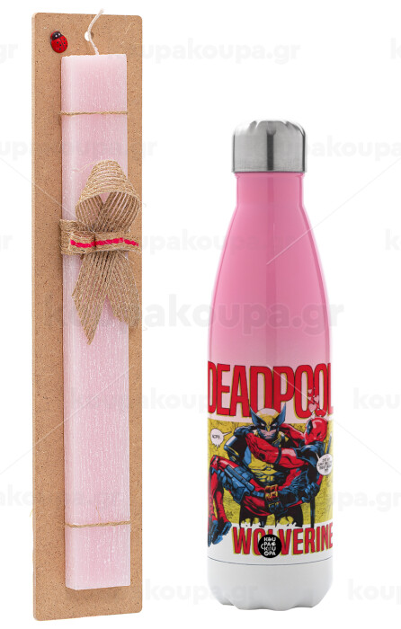Superhero Deadpool Wolverine, Easter Set, Metallic pink/white (Stainless steel) thermos, double-walled, 500ml & aromatic flat Easter candle (30cm) (PINK)