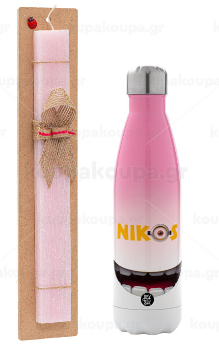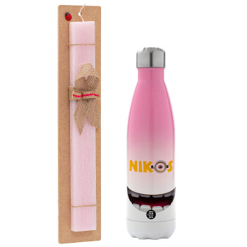 The minions, Easter Set, Metallic pink/white (Stainless steel) thermos, double-walled, 500ml & aromatic flat Easter candle (30cm) (PINK)