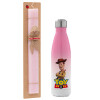 Woody cowboy, Easter Set, Metallic pink/white (Stainless steel) thermos, double-walled, 500ml & aromatic flat Easter candle (30cm) (PINK)