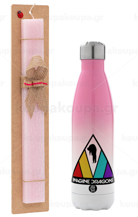 Imagine Dragons, Easter Set, Metallic pink/white (Stainless steel) thermos, double-walled, 500ml & aromatic flat Easter candle (30cm) (PINK)