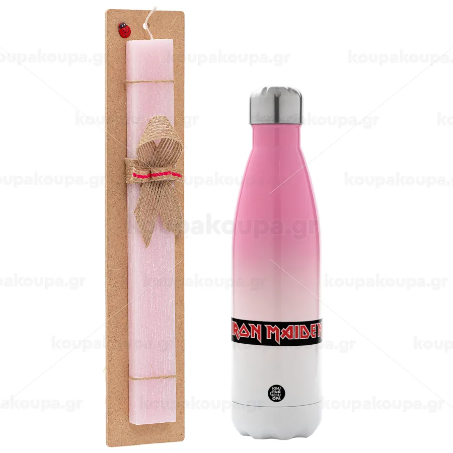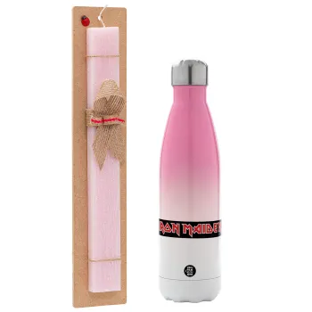 Iron maiden, Easter Set, Metallic pink/white (Stainless steel) thermos, double-walled, 500ml & aromatic flat Easter candle (30cm) (PINK)