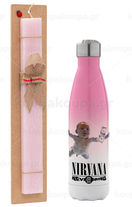 Nirvana nevermind, Easter Set, Metallic pink/white (Stainless steel) thermos, double-walled, 500ml & aromatic flat Easter candle (30cm) (PINK)
