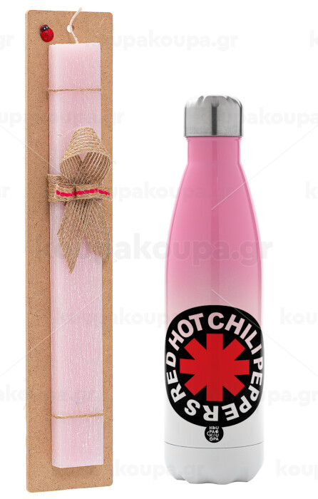 Red Hot Chili Peppers, Easter Set, Metallic pink/white (Stainless steel) thermos, double-walled, 500ml & aromatic flat Easter candle (30cm) (PINK)