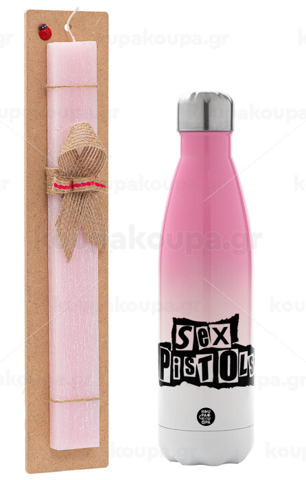 Sex Pistols, Easter Set, Metallic pink/white (Stainless steel) thermos, double-walled, 500ml & aromatic flat Easter candle (30cm) (PINK)