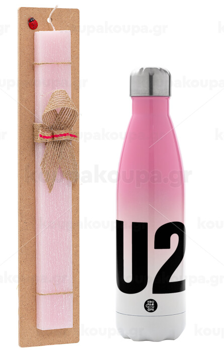 U2 , Easter Set, Metallic pink/white (Stainless steel) thermos, double-walled, 500ml & aromatic flat Easter candle (30cm) (PINK)
