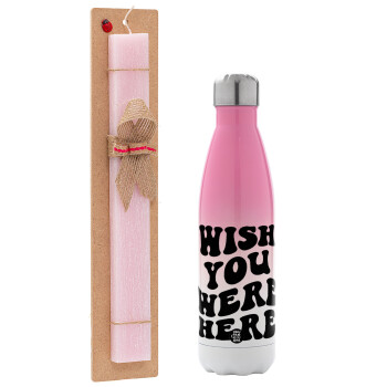 Wish you were here, Easter Set, Metallic pink/white (Stainless steel) thermos, double-walled, 500ml & aromatic flat Easter candle (30cm) (PINK)