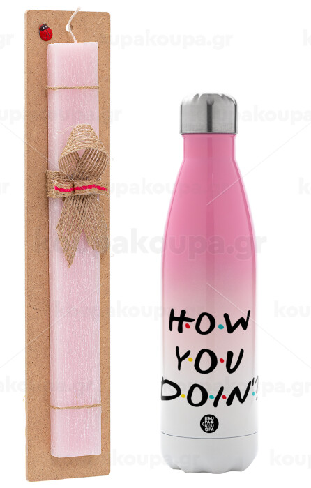 Friends How You Doin'?, Easter Set, Metallic pink/white (Stainless steel) thermos, double-walled, 500ml & aromatic flat Easter candle (30cm) (PINK)