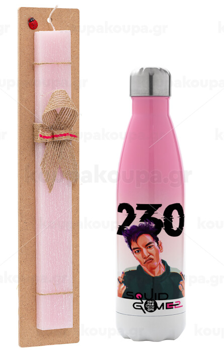 Squid game 2, Thanos 230, Easter Set, Metallic pink/white (Stainless steel) thermos, double-walled, 500ml & aromatic flat Easter candle (30cm) (PINK)