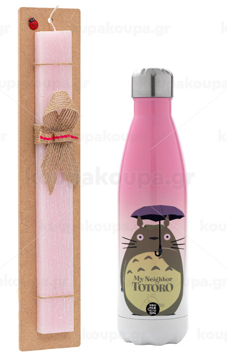 Totoro from My Neighbor Totoro, Easter Set, Metallic pink/white (Stainless steel) thermos, double-walled, 500ml & aromatic flat Easter candle (30cm) (PINK)