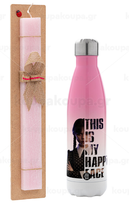 Wednesday, This is my happy face, Easter Set, Metallic pink/white (Stainless steel) thermos, double-walled, 500ml & aromatic flat Easter candle (30cm) (PINK)