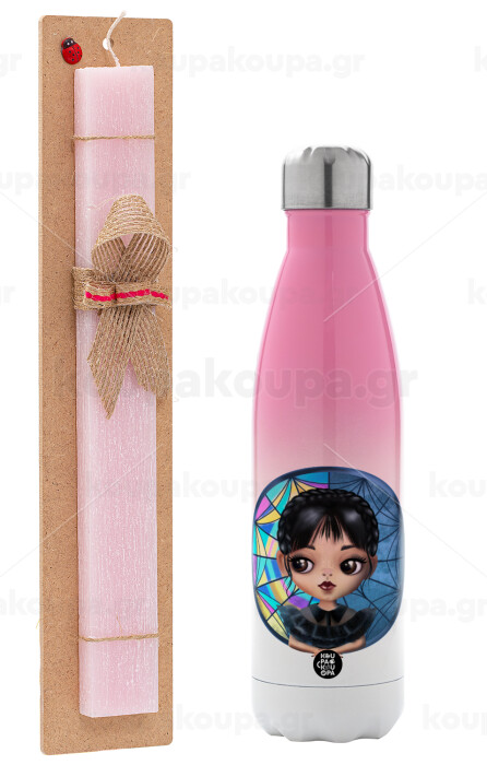 Wednesday big eyes, Easter Set, Metallic pink/white (Stainless steel) thermos, double-walled, 500ml & aromatic flat Easter candle (30cm) (PINK)