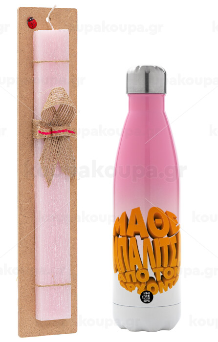 Μάθε μπαλίτσα από τον Άρχοντα, Easter Set, Metallic pink/white (Stainless steel) thermos, double-walled, 500ml & aromatic flat Easter candle (30cm) (PINK)