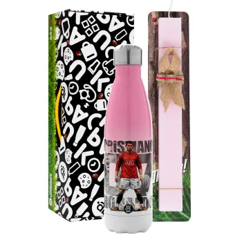 Cristiano Ronaldo (Κριστιάνο Ρονάλντο), Easter Set, Metallic pink/white (Stainless steel) thermos, double-walled, 500ml & aromatic flat Easter candle (30cm) (PINK)