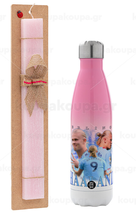 Erling Haaland, Easter Set, Metallic pink/white (Stainless steel) thermos, double-walled, 500ml & aromatic flat Easter candle (30cm) (PINK)