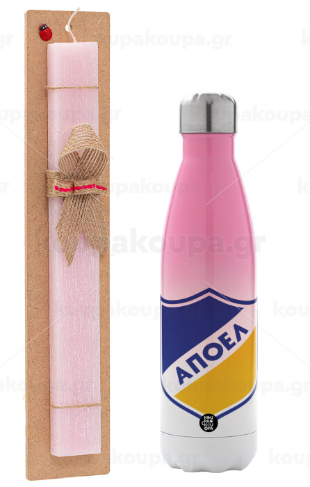 FC ΑΠΟΕΛ Λευκωσίας, Easter Set, Metallic pink/white (Stainless steel) thermos, double-walled, 500ml & aromatic flat Easter candle (30cm) (PINK)