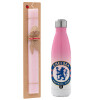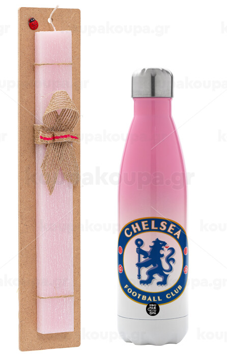 FC Chelsea, Easter Set, Metallic pink/white (Stainless steel) thermos, double-walled, 500ml & aromatic flat Easter candle (30cm) (PINK)