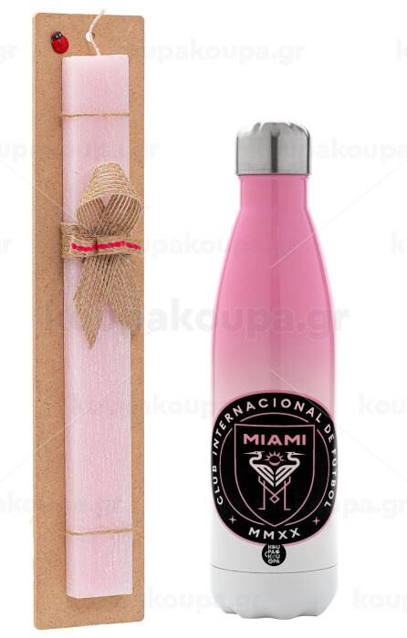 Inter Miami CF, Easter Set, Metallic pink/white (Stainless steel) thermos, double-walled, 500ml & aromatic flat Easter candle (30cm) (PINK)