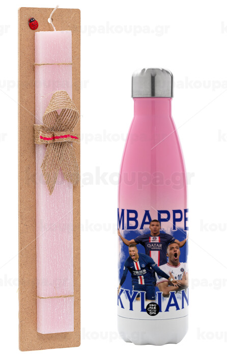 Kylian Mbappé, Easter Set, Metallic pink/white (Stainless steel) thermos, double-walled, 500ml & aromatic flat Easter candle (30cm) (PINK)