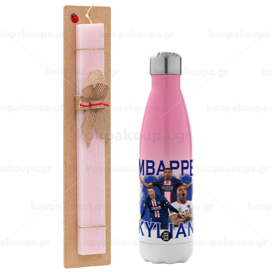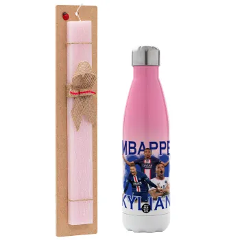 Kylian Mbappé, Easter Set, Metallic pink/white (Stainless steel) thermos, double-walled, 500ml & aromatic flat Easter candle (30cm) (PINK)