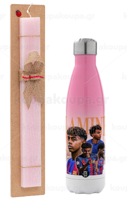 lamine yamal FCB, Easter Set, Metallic pink/white (Stainless steel) thermos, double-walled, 500ml & aromatic flat Easter candle (30cm) (PINK)