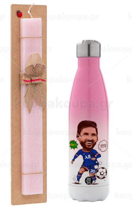 Lionel Messi drawing, Easter Set, Metallic pink/white (Stainless steel) thermos, double-walled, 500ml & aromatic flat Easter candle (30cm) (PINK)