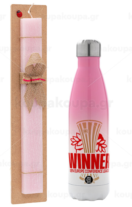 Europa Conference League WINNER, Easter Set, Metallic pink/white (Stainless steel) thermos, double-walled, 500ml & aromatic flat Easter candle (30cm) (PINK)