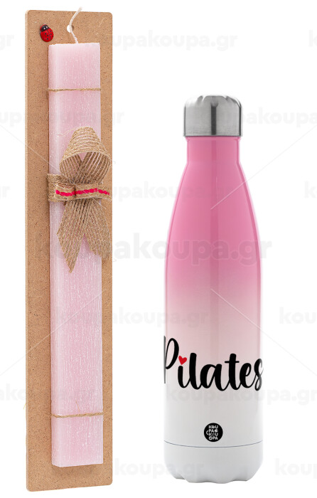 Pilates love, Easter Set, Metallic pink/white (Stainless steel) thermos, double-walled, 500ml & aromatic flat Easter candle (30cm) (PINK)