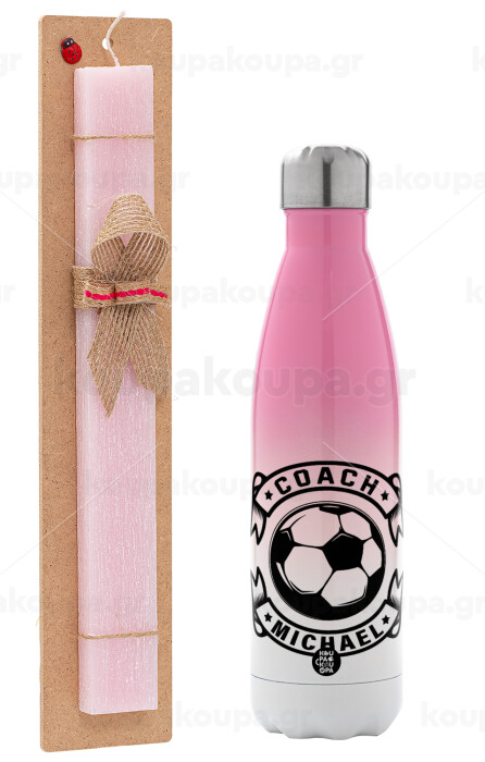 Soccer coach, Easter Set, Metallic pink/white (Stainless steel) thermos, double-walled, 500ml & aromatic flat Easter candle (30cm) (PINK)