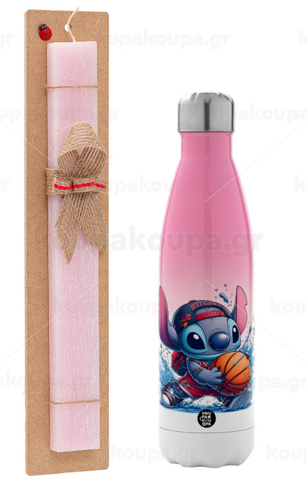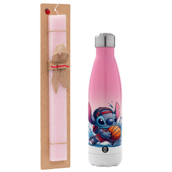Stitch Basketball, Easter Set, Metallic pink/white (Stainless steel) thermos, double-walled, 500ml & aromatic flat Easter candle (30cm) (PINK)