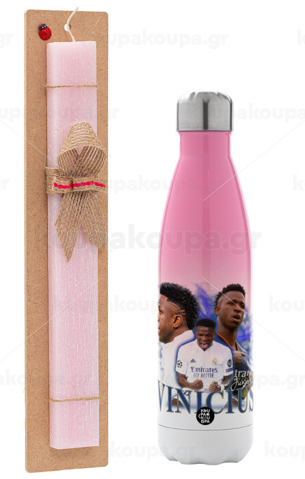 Vinicius Junior, Easter Set, Metallic pink/white (Stainless steel) thermos, double-walled, 500ml & aromatic flat Easter candle (30cm) (PINK)