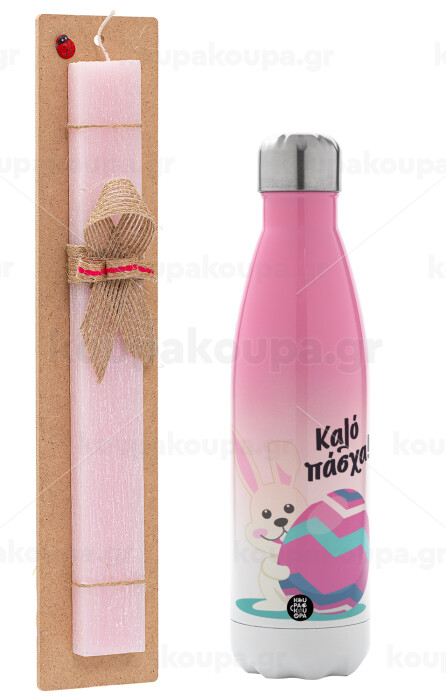 Καλό πάσχα, Easter Set, Metallic pink/white (Stainless steel) thermos, double-walled, 500ml & aromatic flat Easter candle (30cm) (PINK)