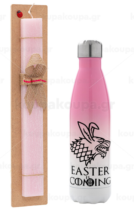 Easter is coming (GOT), Easter Set, Metallic pink/white (Stainless steel) thermos, double-walled, 500ml & aromatic flat Easter candle (30cm) (PINK)
