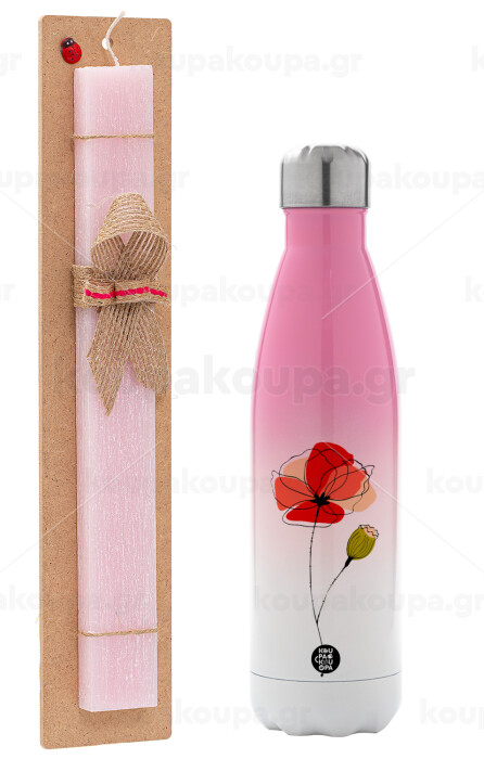 Red poppy flowers papaver, Easter Set, Metallic pink/white (Stainless steel) thermos, double-walled, 500ml & aromatic flat Easter candle (30cm) (PINK)