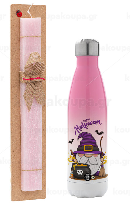 Happy Halloween (Χαλοουίν), Easter Set, Metallic pink/white (Stainless steel) thermos, double-walled, 500ml & aromatic flat Easter candle (30cm) (PINK)