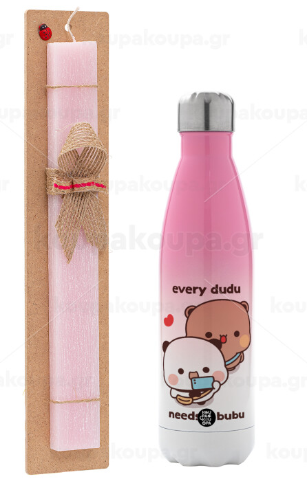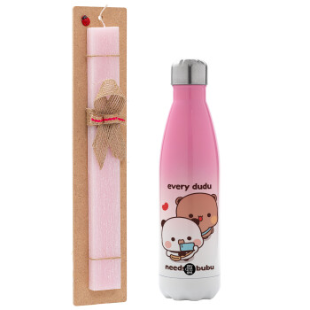 Every Dudu needs a bubu, Easter Set, Metallic pink/white (Stainless steel) thermos, double-walled, 500ml & aromatic flat Easter candle (30cm) (PINK)