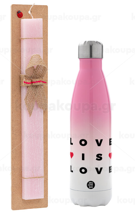Love is Love, Easter Set, Metallic pink/white (Stainless steel) thermos, double-walled, 500ml & aromatic flat Easter candle (30cm) (PINK)
