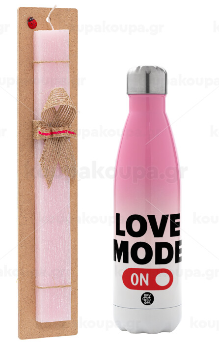 LOVE MODE ON, Easter Set, Metallic pink/white (Stainless steel) thermos, double-walled, 500ml & aromatic flat Easter candle (30cm) (PINK)